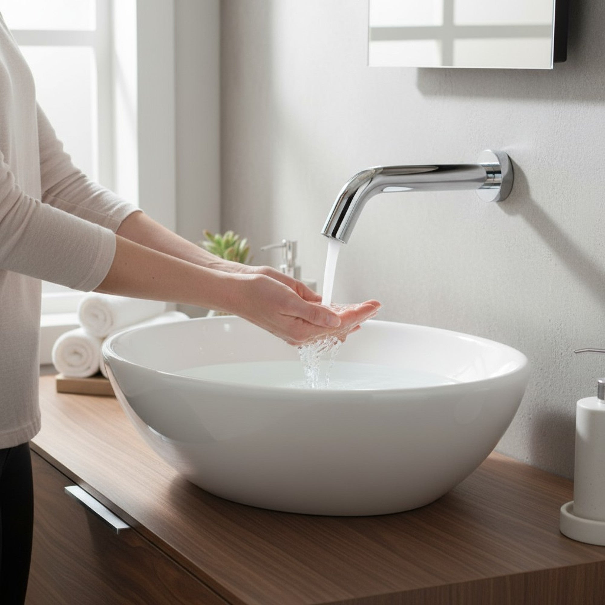Der elektronische Auslauf ist eine moderne, batteriebetriebene Wandarmatur, die höchsten hygienischen und funktionalen Anforderungen entspricht. Dank der integrierten Fotozellensteuerung erfolgt die Wasserabgabe berührungslos – ideal für öffentliche und gewerbliche Sanitärräume, in denen Hygiene und Komfort oberste Priorität haben.