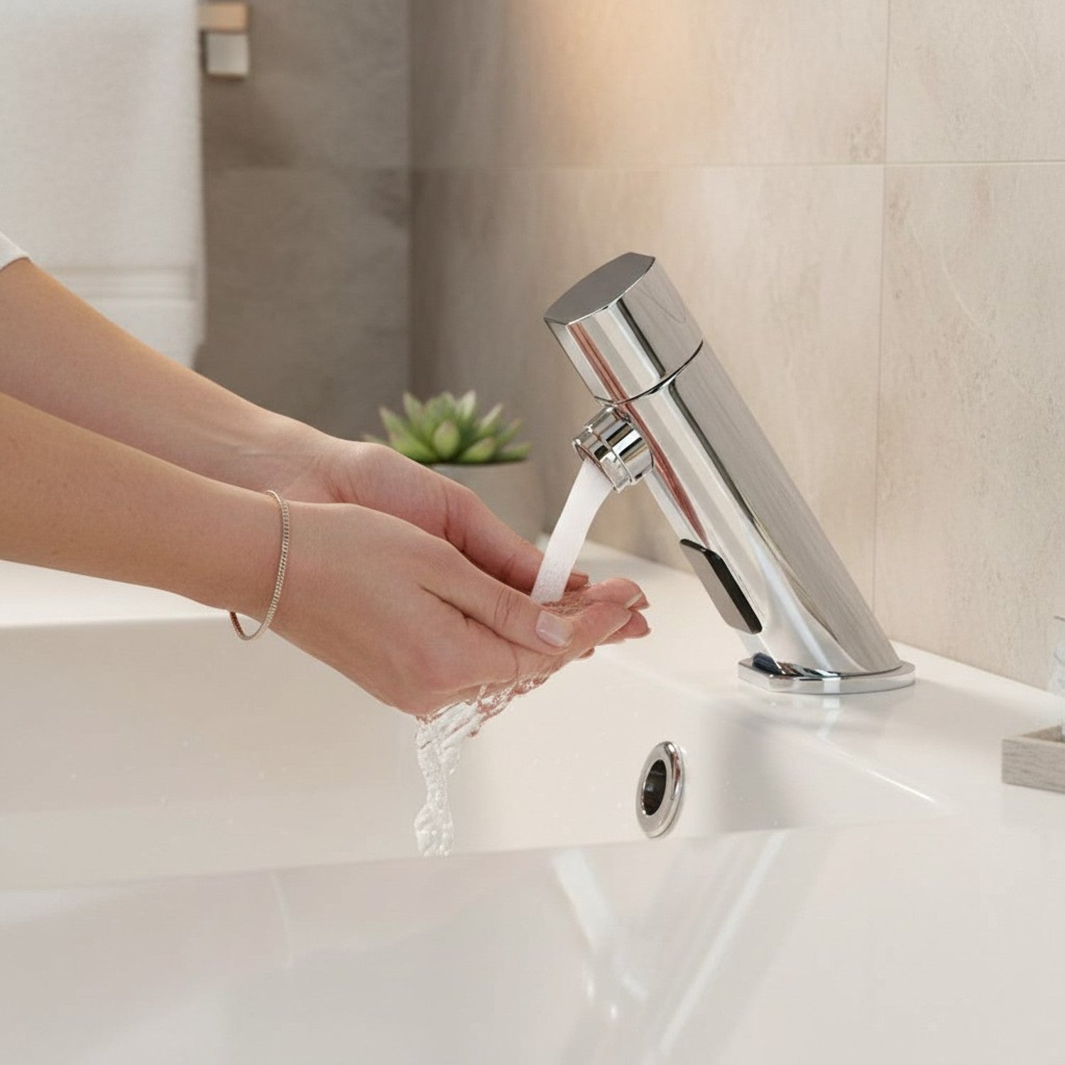 Diese elektronische Mischbatterie ist besonders für den Einsatz in öffentlichen und gewerblichen Bereichen geeignet. Der Infrarot-Sensor startet den Wasserfluss automatisch und die Mischbatterie schließt selbsttätig nach Beendigung des Waschvorgangs.